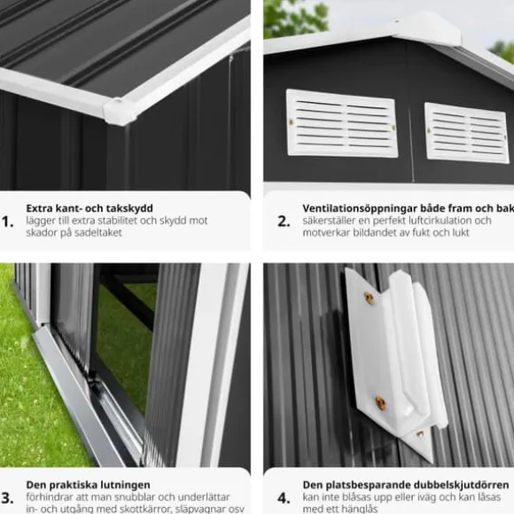 En av de mest användbara funktionerna i detta trädgårdshus är de dubbla skjutdörrarna. Dessa dörrar gör det enkelt att komma åt dina förråd utan att ta upp extra utrymme när de öppnas. För ökad säkerhet kan ett hänglås läggas till på dörrhandtagen, så att dina föremål alltid är trygga och säkra.