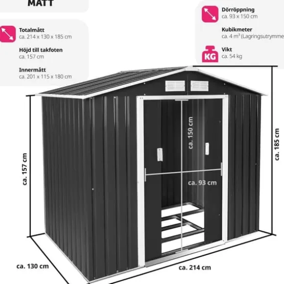 Oavsett om du behöver mer förvaringsutrymme för trädgårdsredskap, cyklar eller utemöbler, är vårt trädgårdshus den perfekta lösningen. Med sina mått på 214 x 130 x 185 cm erbjuder det tillräckligt med plats samtidigt som det är kompakt nog att passa in i de flesta utomhusområden. Metallfundamentet och de praktiska skjutdörrarna gör det till en pålitlig och långvarig investering för alla trädgårdsägare.