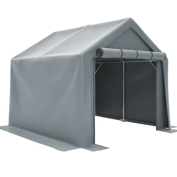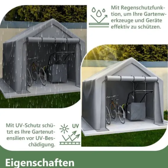 Rymligt redskapsbod- och cykelskjul i tältmodell, ca 244 × 241 × 217 cm, perfekt som cykelgarage, trädgårdsförråd, lagertält eller verktygsskjul. Den stabila stålramen och den väderbeständiga duken skyddar cyklar, motorcyklar, gräsklippare, trädgårdsredskap och utemöbler mot regn, snö, sol och smuts. Det praktiska rullport-systemet gör det enkelt att köra in och ut och ger samtidigt god ventilation när det är öppet.