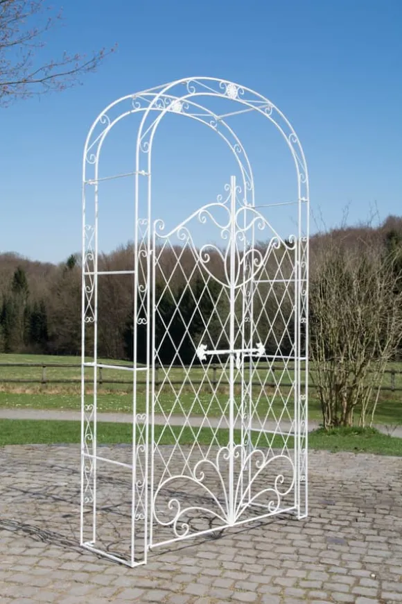 Vår exklusiva rosenbåge Melissa med grind är kärleksfullt dekorerad med många detaljer och är därför idealisk som spaljé för murgröna och andra klätterväxter. Men även fristående är denna rosenbåge med sina två låsbara och vackert dekorerade grindvingar ett blickfång i vilken trädgård som helst. Rosenbågen är handgjord av järn och är därför extremt stabil. Tack vare en beläggning är denna rosenbåge högkvalitativ och extremt hållbar. Detta är särskilt viktigt eftersom valvet inte får kollapsa när trädet står i full blom. Totalt 4 förborrade hål används för att fästa rosenbågen i marken. Detta gör att rosenbågen kan säkras snabbt, enkelt och stabilt. Observera att inga markankare för montering ingår i leveransen. Dessa kan beställas separat.