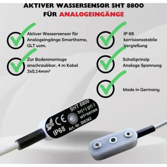 Sensor med två V4A-metallkontakter, som är gjutna i plastkapsling. Så snart vatten eller någon annan ledande vätska kommer i kontakt med de båda kontakterna, ökar utgångsspänningen från nära 0 V till knappt under driftspänningen som används. Sensorkablarna kan lätt förlängas själv (tvärsnitt: 3 x 0,14 kvadratmeter) Vattensensor med gjuten elektronik – perfekt för beläggning av tidigare oanvända analoga ingångar i fastighetsautomation och fastighetsstyrning – korrosionsstabil anordning för högsta säkerhet och lång livslängd för golvmontering – Påskruvbar kompakt, tungt utförande, elastisk, slagtålig, villkorssäker. SHT 8800 vattensensor är inte lämplig för anslutning till Schabus vattendetektorer. OBS! Vi beklagar att vi inte har hunnit översätta denna produkttext. Texten nedan är maskinöversatt från tyska.