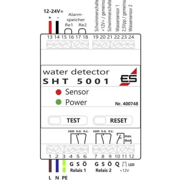SHT 5001 är en vattendetektor för fast installation i en liten fördelare eller elskåp. Den har 2 rapporteringslinjer, som på vardera är kopplade till ett eget larmrelä och vardera 2 ingångar för passiva vattensensorer (AC) eller mini-flottörbrytare (DC). Vid ett larm lyser (ingång 1) eller blinkar (ingång 2) den röda sensor-LED:en, en intern piezo-summer ljuder (permanent deaktiverbar), som kopplar tillordnat relä och en larmutgång (12 V/max. 30 mA) för anslutning av en extern piezo-drivrutin eller en LED (t.ex. för kopplingsskåpdörr) aktiveras. Ett larmminne kan placeras separat med hjälp av en brygga för varje indikator. Kvitteringen av larmet sker internt med en knapptryckning på RESET-knappen eller externt med stängning av potentialfria kontakter (t.ex. extern knapp, mini-flottörbrytare, återställningskontakt från GSM-väljare, etc.). TESTKNAPPEN kontrollerar larminställningarna och simulerar ”vatten” i båda rapporteringslinjer. De anslutna sensorerna och mini-flottören testas inte. SHT 5001 drivs med nätspänning från det offentliga elnätet och/eller 12 / 24 V likspänning ext. Batterier/ackumulatorer Vattensensor eller mini-flottörbrytare? was behöver jag ICH? Det är ganska enkelt att svara på denna fråga: Om det efter användning bara är möjligt att använda her mini-flottrörbrytare, så måste du använda den. För då har du att göra med en vattennivå, en nivå eller ett nav. Även om sensorerna fungerar en tid är de helt olämpliga för fuktiga miljöer med sina blanka kontakter. Tänk på att vattensensorer är förbrukningsvaror. Ju oftare och längre de utsätts för vatten, desto snabbare åldras de och tenderar i bästa fall att öka antalet falsklarm. Även om du är övertygad om att din sensor är riktigt torr, så kan det ändå finnas vatten inuti sensorn som har orsakat betydande korrosion, rost, grönspån, etc. Sensorer är endast avsedda för regelbundet torra miljöer, för detektering av vatten i allmänhet på golv och i synnerhet i tvätt- och diskmaskiner, kanske under pannan eller andra vattenledande apparater, rörledningar, värmeelement, m.m., huvudsakligen torra ytor, som normalt eller förhoppningsvis aldrig kommer vatten till. OBS! Vi beklagar att vi inte har hunnit översätta denna produkttext. Texten nedan är maskinöversatt från tyska.