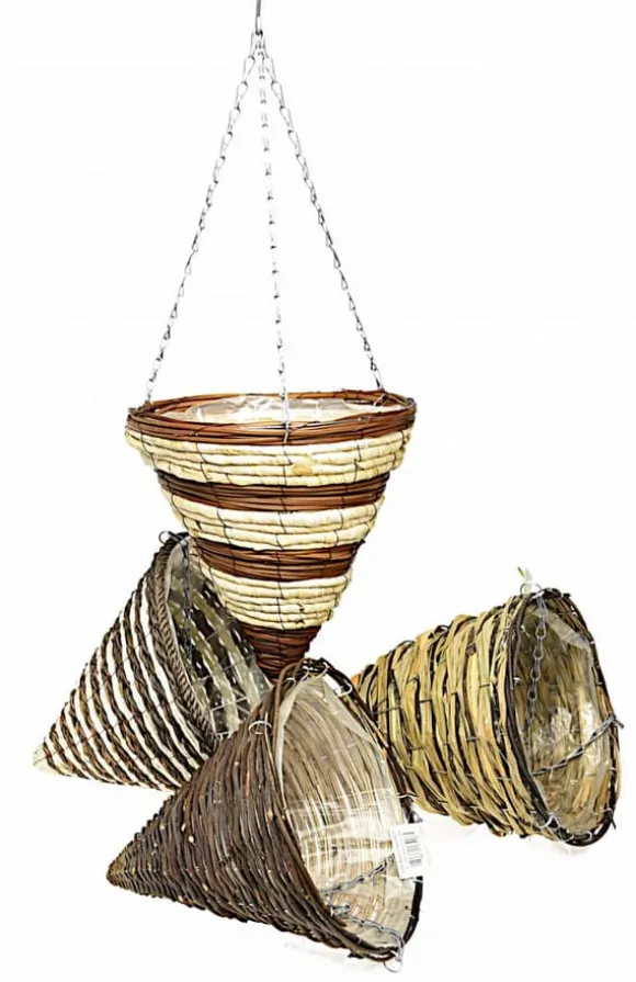 Detta set med fem hängande blomkorgar i naturlig stil är perfekt för att dekorera terrassen, balkongen eller trädgården. Korgarna är tillverkade av miljövänligt material och har en plastinsats som gör det möjligt att plantera direkt utan extra innerkruka.