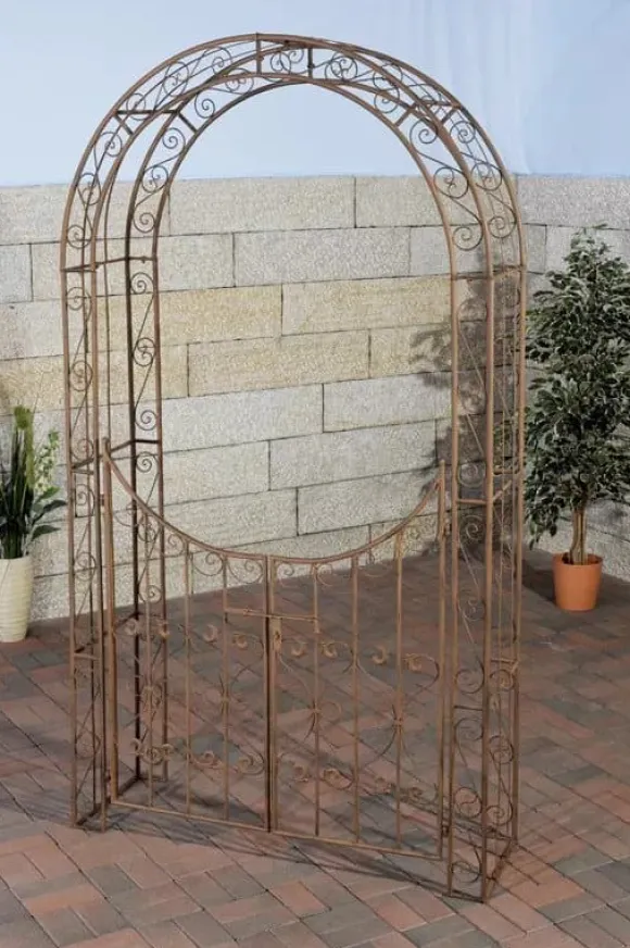 This exclusive rose arch is ideal for creatively designing your garden. It is a real eye-catcher in any garden, either free-standing or overgrown with the two lockable and beautifully decorated gate leaves. The ”SINA” model is handmade from very stable iron tubing. It is assembled from just a few parts, guaranteeing easy setup and immediate use. A coating makes this climbing aid very high-quality and extremely durable. The intricate decorations are not only beautiful, but also offer your climbing plants plenty of room to climb. Dense growth is thus ensured.