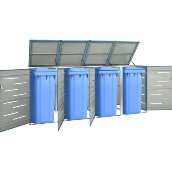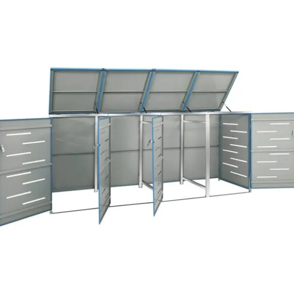 Sopskjulet är tillverkat av galvaniserade stålpaneler och en ram av rostfritt stål, vilket gör det mycket robust och rostbeständigt. Den ihåliga designen släpper in luft och förhindrar otrevliga lukter, medan låset säkerställer säker förvaring av soporna. Dessutom gör det praktiska locket och fjädrarna det enkelt att ta ut och sätta in sopkärlet.