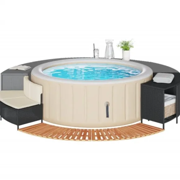 - Multifunktionell: Med ett förvaringsställ, en trätrappa och en trädgårdsbänk skapar denna spa-kant en mer funktionell och användarvänlig spaavdelning.