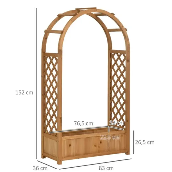 Planteringslåda i naturträ med båge och spaljéGe trädgården ett varmt, naturligt uttryck med denna planteringslåda i gran. Den rymliga lådan rymmer blommor, grönsaker och örter, medan den eleganta bågen och spaljéerna på sidorna ger perfekt stöd för klätterväxter och dekor.