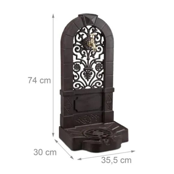 Denna antika ståfontän är perfekt för att ge nostalgisk charm till din trädgård eller terrass. Den har en praktisk kran och skål, ett galler för förvaring av vattenkannor samt en öppen bakpanel för enkel vattenanslutning. Tillverkad av hållbar mörkbrun aluminium, kombinerar den klassisk design med praktisk funktionalitet.