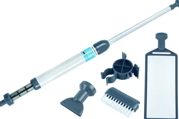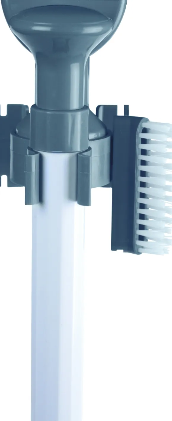 Allt-i-ett lättvikts verktyg som gör målinriktad rengöring av trädgårdsbassänger, pools och spa både snabbt och enkelt. Med en enkel pumpfunktion skapas ett kraftigt vakuum som super upp smuts, sand och småsten. Smutsen samlas i en filterbehållare, som lätt kan tömmas. Setet inkluderar borste, ytvattenskimmer, ett brett och ett smalt sugmunstycke samt en praktisk vägg upphäng.
