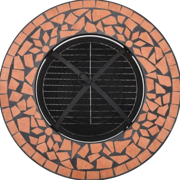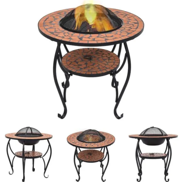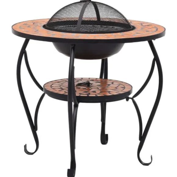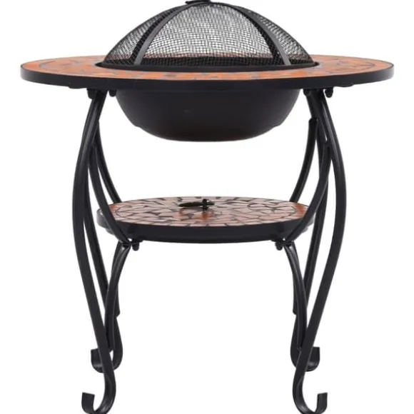 Eldfatet är tillverkad i högkvalitativt stål, och är utmärkt på att absorbera och utstråla värme. Det kan användas för att bränna torrt trä, stockar eller kol. Eldfatet har fyra ben. Det medföljande säkerhetsnätet gör att du kan titta på den brinnande elden, som är omsluten för säkerhet och förhindrar gnistor och skräp som flyger ut. Eldgaffeln kan användas för att både ta bort nätskyddet och ordna om veden eller kolet. Dessutom kan eldstaden också användas som grill. Dess runda keramiska yta erbjuder en perfekt plats för drycker och annat. Observera att denna produkt inte är lämplig att lämnas ute i kallt väder.