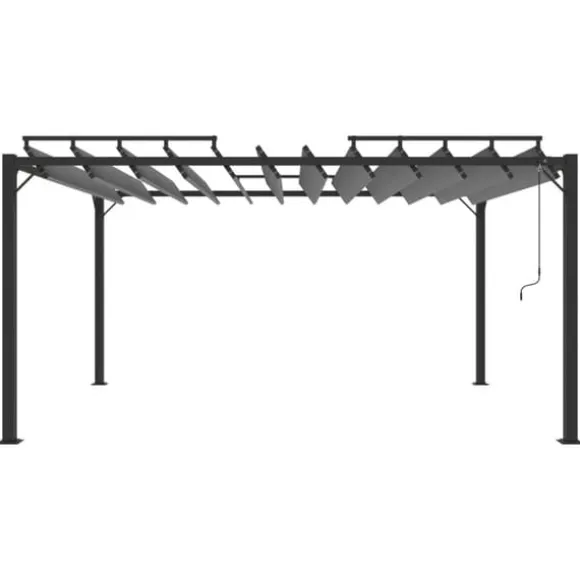 Denna paviljong är tillverkad i PA-behandlat tyg som är vatten- och smutsavvisande. Den starka aluminiumramen gör paviljongen stadig och mycket hållbar. Paviljongen har ett justerbart lamelltak. Lamellerna kan enkelt vridas och justeras till rätt position med handveven. Öppna dem när du vill njuta av solen och stäng dem för att få skugga eller skydd mot regn. Paviljongen är ett perfekt val för utomhusaktiviteter.