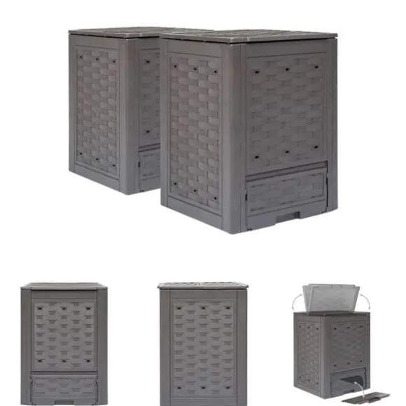 Kompostlådorna är tillverkade i plast som gör dem UV- och väderbeständiga. Enheten har en lätt stomme och ett prydligt utseende. Den har ett delat lock för optimal bevattning och ventilation. Tack vare ventilationshålen på sidodelen kan avfallslådan uppnå optimal kompostering på ett ypperligt sätt. Den fyrkantiga komposten kommer väl till hands vid återvinning och smälter samtidigt fint in i trädgården.