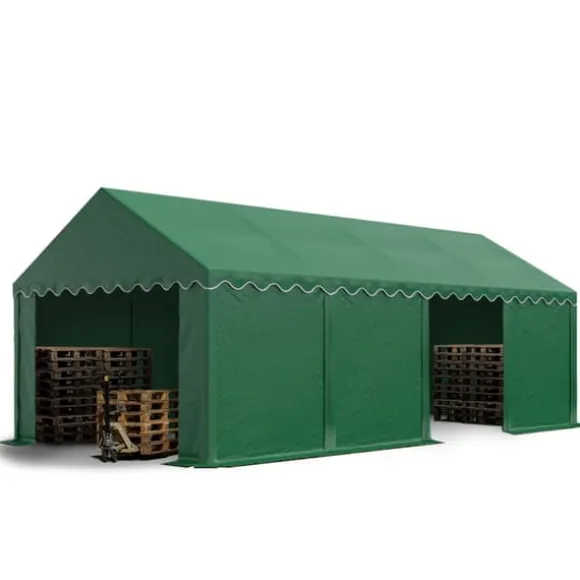 Ett lagertält är den enklaste lösningen för kortare och tillfälliga projekt. Tältet kan monteras på kort tid och med separat gavel- och sidodelar kan tältet formas helt efter eget behov. Det här lagertältet har lättmonterade stålstänger av helförzinkat, korrosionsskyddat stål och en PVC-duk. PVC-duken har en högt UV- skydd, är UV-resistent och 100% vattentät med hjälp av svetsade sömmar. Sidodelarna kan monteras separat mellan varje sektion av konstruktionen med 2m avstånd mellan stolparna och möjliggör därmed många olika ingångsvarianter.