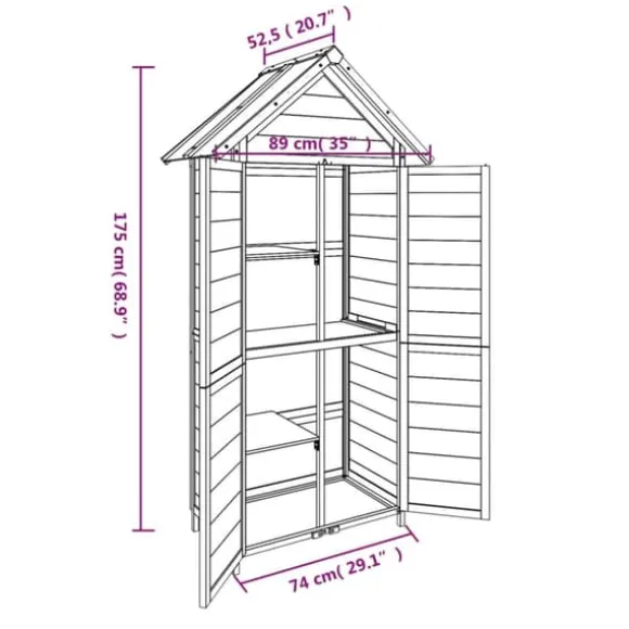 - Stort och organiserat utrymme: Denna träbod är perfekt utformad för olika trädgårdsredskap, gräsklippningsutrustning, pooltillbehör och redskap som kvastar, krattor etc.