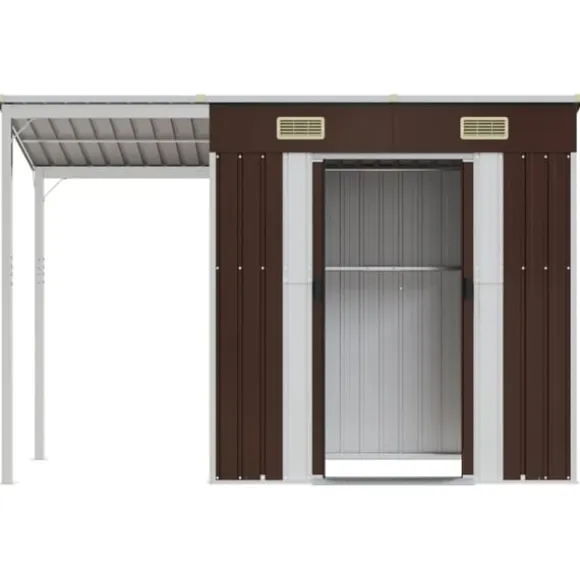 - Godt om förvaringsutrymme: Denna metallbod erbjuder gott om plats för att förvara ved, trädgårdsverktyg, möbler, utrustning och mer. Den har också ett förlängt tak för förvaring av ved. Taket kan fästas på vardera sidan av skjulet.