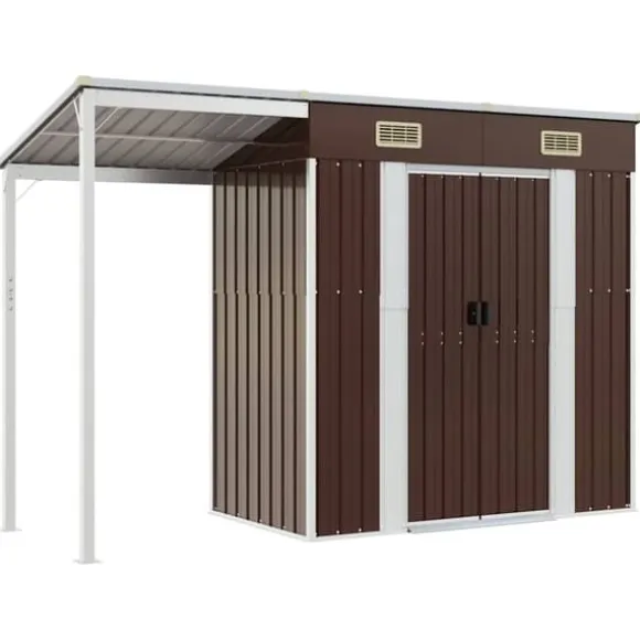 - Godt om förvaringsutrymme: Denna metallbod erbjuder gott om plats för att förvara ved, trädgårdsverktyg, möbler, utrustning och mer. Den har också ett förlängt tak för förvaring av ved. Taket kan fästas på vardera sidan av skjulet.