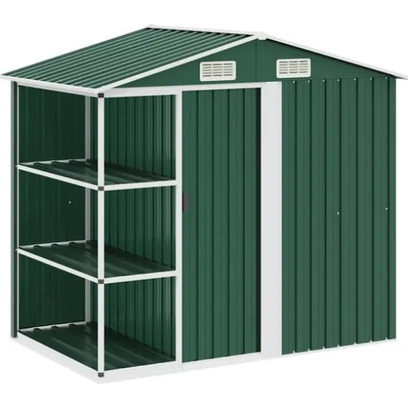 Detta förråd är tillverkat av galvaniserat järn så det är stabilt och lätt att underhålla. Trädgårdsskjulet har ventiler både fram och bak, vilket säkerställer utmärkt ventilation. Dess enda skjutdörr med plasthandtag framtill gör det enkelt att komma in och ut.