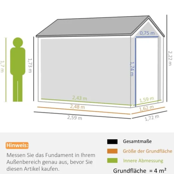 - Mått: Totalt 259L x 172B x 222H cm; Inre 248L x 162B cm; Dörr 75B x 174H cm; Fönster 69B x 70H cm; Takfotshöjd 173 cm