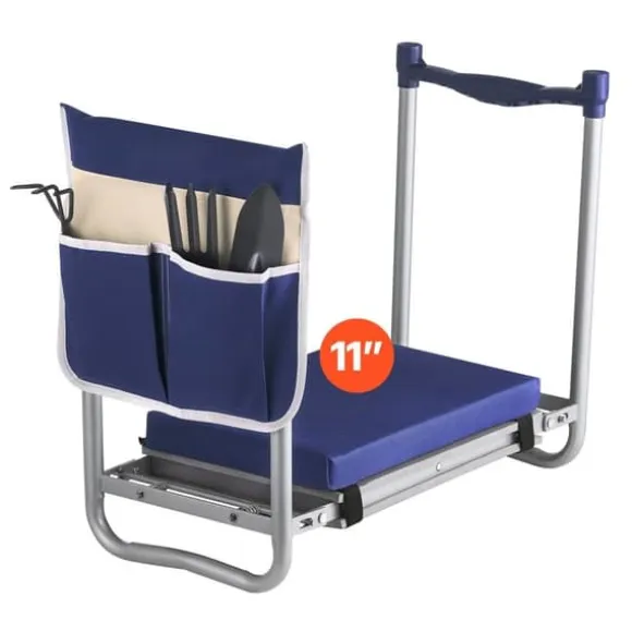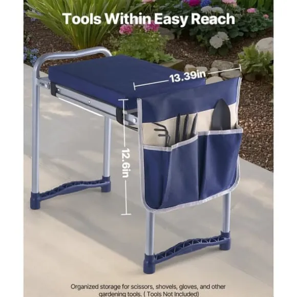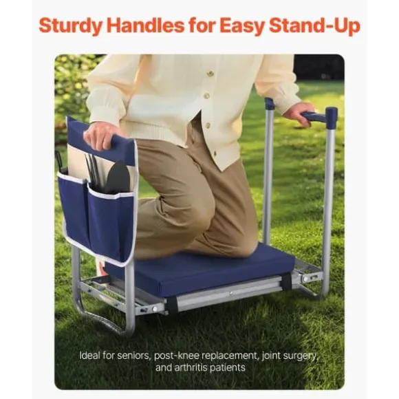 - Lätt att ställa upp: Trädgårdspallen har sidohandtag för extra stöd vid resning i knästående position, vilket är särskilt användbart för seniorer eller personer med nedsatt rörlighet. Halkfria rör i botten säkerställer stabilitet och trygghet under användning.
