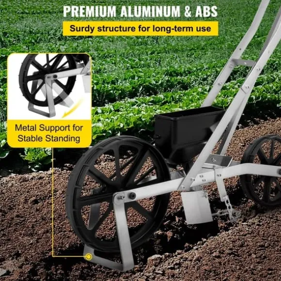 Premium-aluminium & ABS – Vår såmaskin är tillverkad av högkvalitativ aluminium och ABS. Dessa robusta material är rostfria och tillräckligt hållbara för långvarig utomhusbruk.