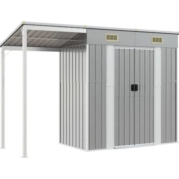- Godt om förvaringsutrymme: Denna metallbod erbjuder gott om plats för att förvara ved, trädgårdsverktyg, möbler, utrustning och mer. Den har också ett förlängt tak för förvaring av ved. Taket kan fästas på vardera sidan av skjulet.