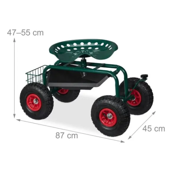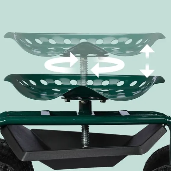 Denna mobila trädgårdsstol erbjuder en bekväm och ergonomisk lösning för trädgårdsarbete, vilket hjälper till att minska belastningen på rygg och knän. Den justerbara sitthöjden, den robusta stålramen och den praktiska förvaringen för verktyg gör den idealisk för ogräsrensning, skörd och andra utomhussysslor. Stolen är lätt att manövrera tack vare handtaget och de pneumatiska hjulen, vilket säkerställer enkel navigering över olika underlag.