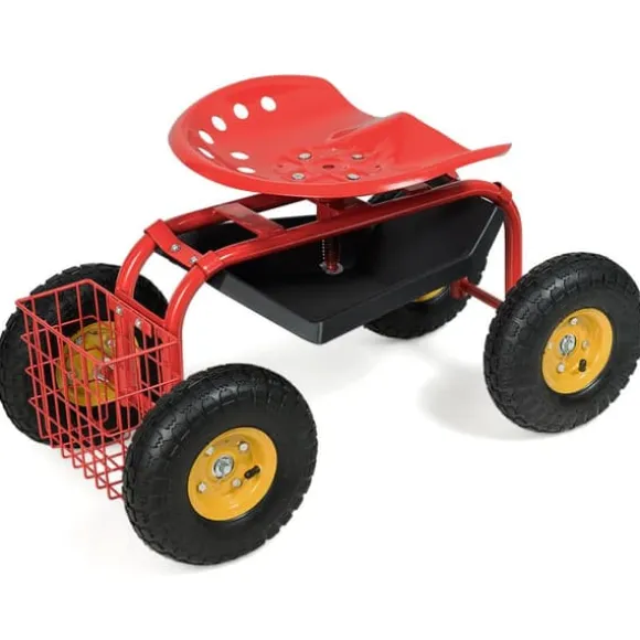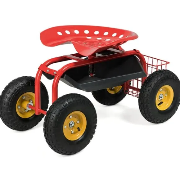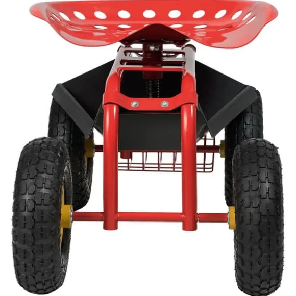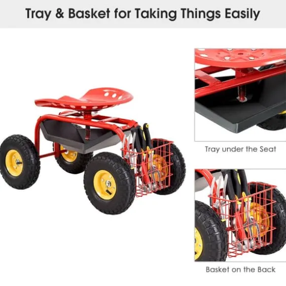 - Förvaringskorg & verktygbricka: arbetsstolen är utrustad med en bricka som är under sätet och en korg som är på baksidan för att förvara dina verktyg och vatten. Det är bekvämt att ta saker från dessa platser när du sitter på vagnen.