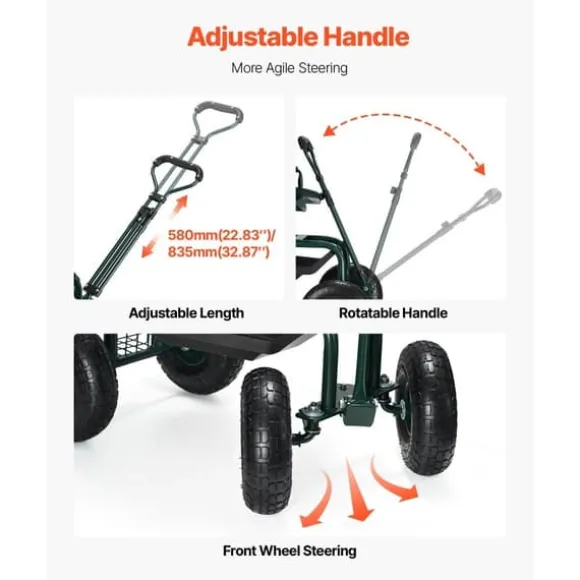De 25 cm uppblåsbara terrängdäcken absorberar stötar och möjliggör smidig körning på ojämn mark. Den 360° roterande sitsen ger enkel manövrering och ergonomisk komfort för långa arbetspass. Den robusta konstruktionen stödjer upp till 180 kg och har en avtagbar verktygslåda för enkel förvaring. Denna trädgårdsvagn uppfyller alla behov för trädgårdsarbete och andra utomhusuppgifter.
