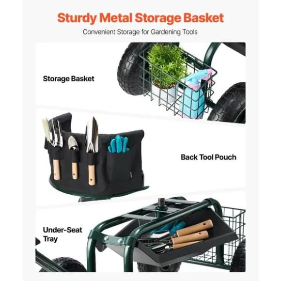 Denna rullande trädgårdsvagn med säte är det perfekta redskapet för trädgårdsarbete och andra utomhusuppgifter. Den är utrustad med 25 cm terrängdäck för en smidig körning på ojämn terräng, en 360° roterande sits för enkel manövrering och en robust konstruktion för att stödja upp till 180 kg.
