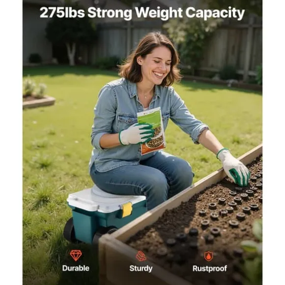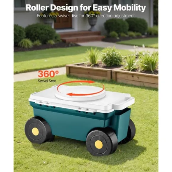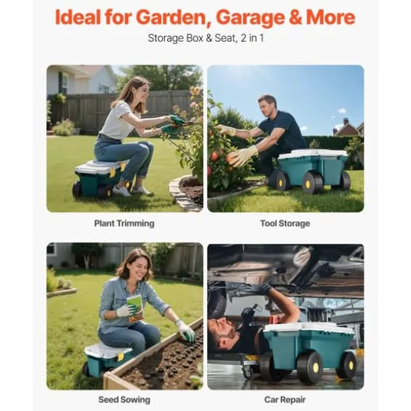 Den rullande trädgårdsvagnen med sits är designad för att minska rygg- och knäsmärta, vilket gör den perfekt för trädgårdsarbete. Med denna vagn kan du enkelt ta hand om lågmarksuppgifter utan att behöva böja dig eller huka dig vilket gör trädgårdsarbetet bekvämare och mer effektivt.