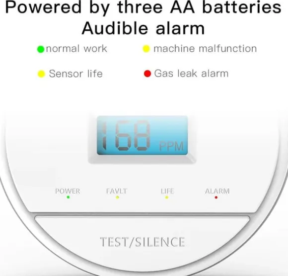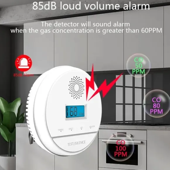 Högt larm: Kolmonoxiddetektorn är utrustad med ett inbyggt 85dB högt larm för att varna dig i händelse av farliga kolmonoxidnivåer, så att snabba åtgärder kan vidtas.