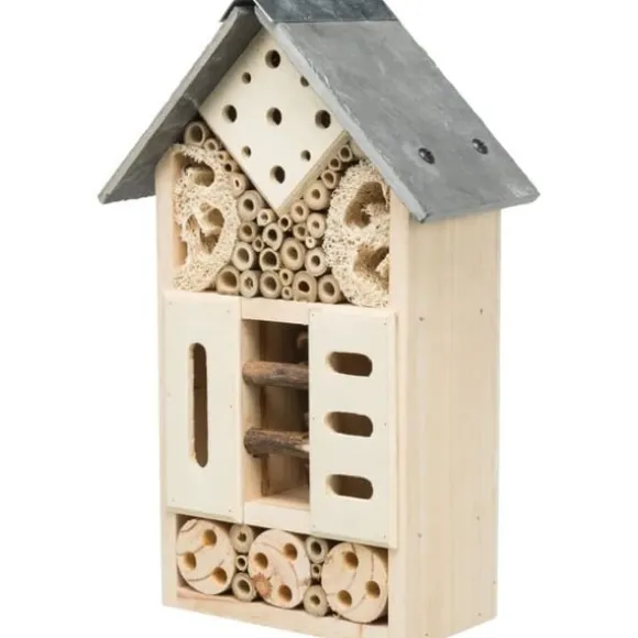 Dataåtervunna: Hotell – Tillverkat av trä och skiffer – Hjälper nyttiga insekter att övervintra och bygga bo – Kottar ger skydd för nyckelpigor och gröna spetsar – Kvistar och ihåliga stjälkar hjälper vissa getingar och bin att bygga bo – För permanent fixering