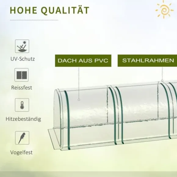 – Stabil, hållbar design: Den starka, pulverlackerade stålramen är täckt med transparent plastfolie som skyddar dina växter mot kyla. Täckningen har en överhängande kant som kan grävas ner i marken för att öka stabiliteten och hålla täckningen tät.