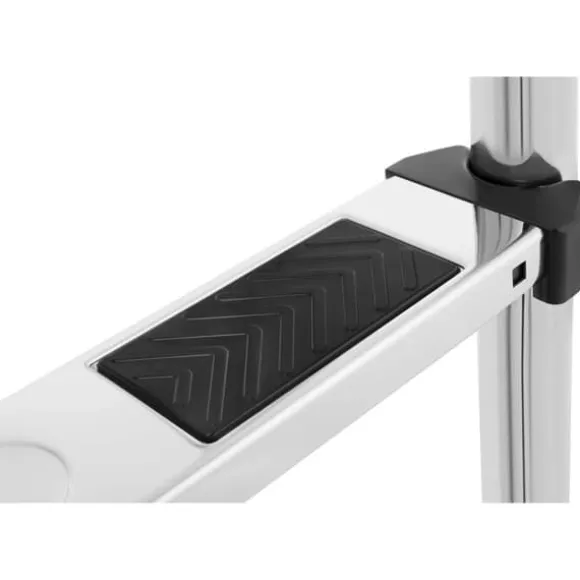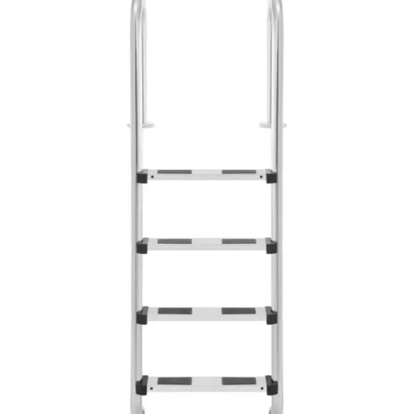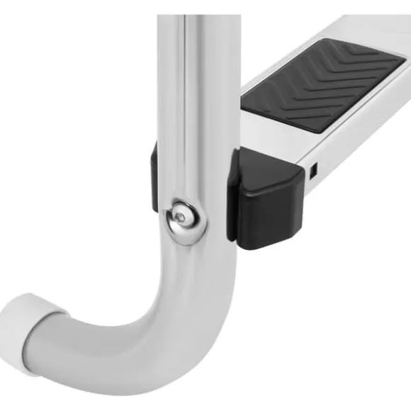 De fyra stegen, som är fast fixerade vid ledstängerna, är 7,5 centimeter djupa och extra breda för att ge bra fotfäste. Den halksäkra ovansidan på stegen minskar också risken för att halka och eventuella påföljande skador. Vassa kanter eller hörn täcks av passande plastskydd. Poolstegen är mycket robust och kan belastas med 180 kg.
