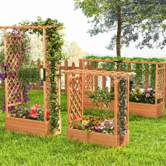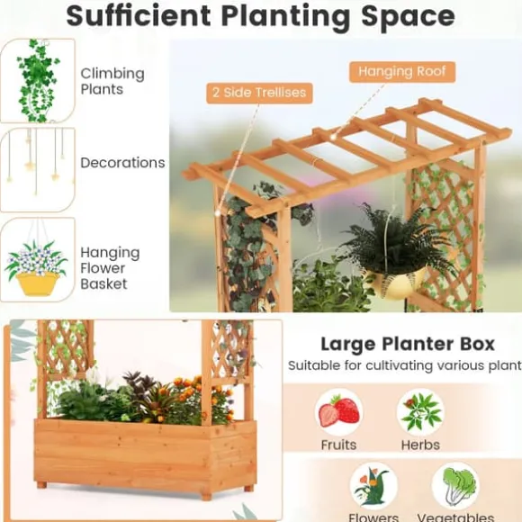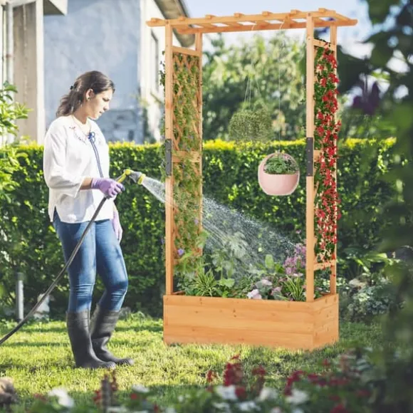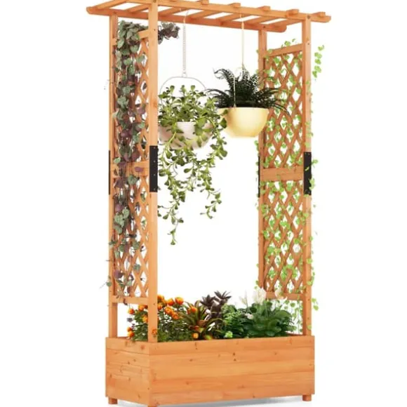 Höjdbädd med bågspaljé i orange är ett stabilt och stilfullt tillskott till vilken trädgård som helst. Tillverkad av naturligt fura trä, den har en planteringslåda, spaljé och hängande tak, vilket gör den idealisk för att odla olika växter, inklusive klätterväxter och vinstockar.