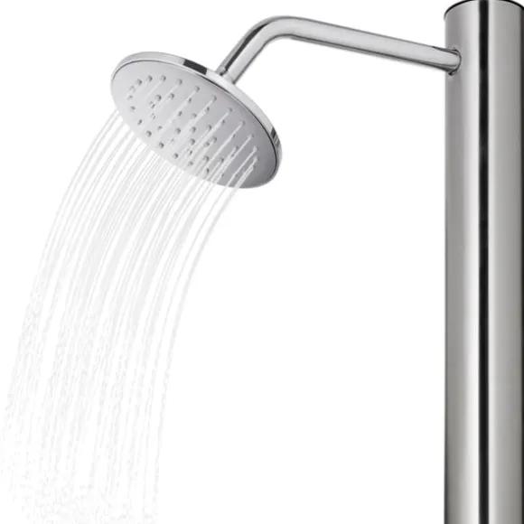 Denna utedusch är tillverkad i rostfritt stål vilket gör den väderbeständig. Duschsystemet har en huvuddusch och en fotkran för att möta dina olika behov.