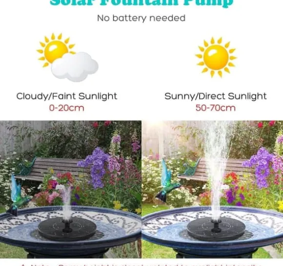 Fontänen drivs av solceller och har 4 olika munstycken. Inga batterier krävs! Pumpen sitter på undersidan och behöver vara helt under ytan för att kunna dra upp vatten. Fontänen behöver full sol för att fungera som den ska. Vid molnigt väder går pumpen enbart då och då. En solig dag är den här lilla fontänen den perfekta vattendekorationen!