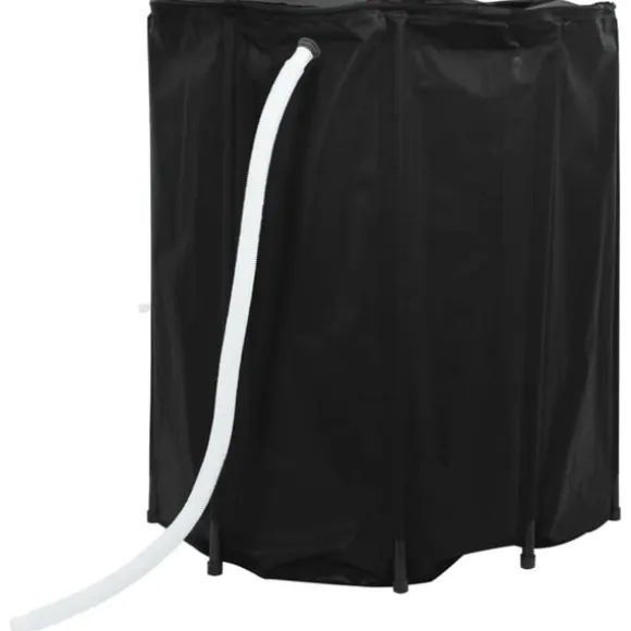 Den hopfällbara regntunnan samlar vatten från regnskurar och sparar vattnet i tanken för senare användning.