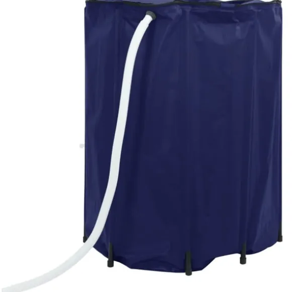 Den hopfällbara regntunnan samlar vatten från regnskurar och sparar vattnet i tanken för senare användning.
