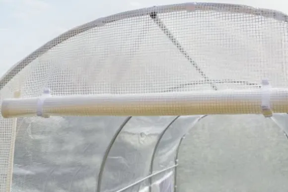 Detta växthus har en stomme av galvaniserade 24 mm profiler. Duken är tillverkad av PE-film som är UV-beständig. Duken har 6 fönster med myggnätsfäste och är vit till färgen. Varje ingång eller utgång har en rejäl dragkedja. Detta håller skadedjur borta. Tygets undersida har extra klaffar som förhindrar att vinden slår under växthuset.