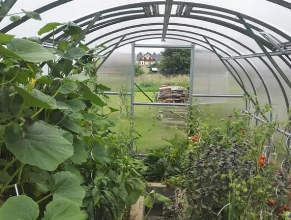 Växthuset har en dubbeldörr i ena änden och ett fönster i den andra änden. Dessutom kan du köpa luckor, gångavskiljare, bord, automatisk lucköppnare, extra dörrar, ett fack inne i växthuset, bevattningssystem.