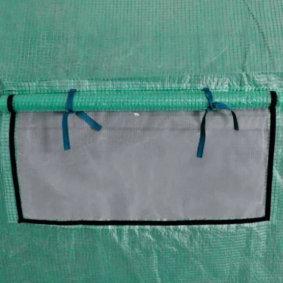 Walk-in-växthuset har en dörr med dubbla dragkedjor som kan rullas upp för enkelt tillträde såväl som för vädring. De 8 fönstren (4 på varje sida), med skydd som går att rulla upp, möjliggör korsventilation under varma dagar.