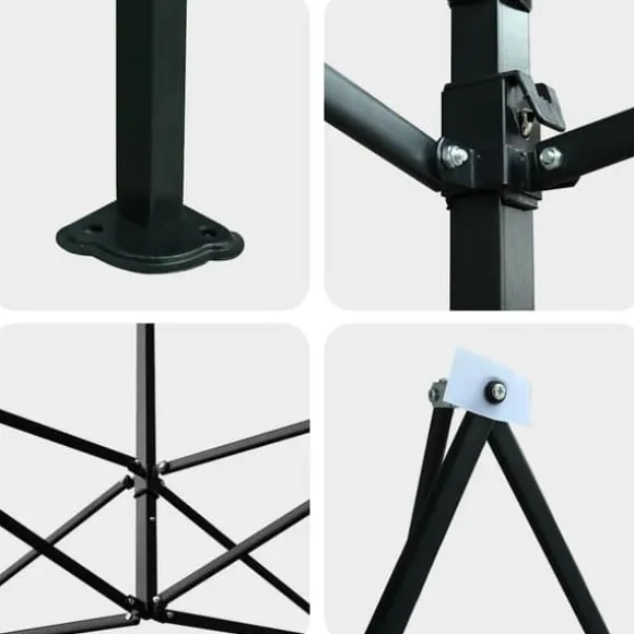 - Täck inte över tyget när du sträcker ut ramen till största möjliga utsträckning. Annars kommer tyget att brytas. Det skulle vara mycket bättre att ta en ihålig tegelsten för att stabilisera varje fot. Produkten är inte lämplig för väder som stark vind, snöfall och extremt väder. Vissa delar kan innehålla vassa kanter, använd skyddshandskar vid behov. Kontrollera att du har alla delar innan du monterar. Håll barn och djur borta från monteringsområdet. Se till att du har tillräckligt med utrymme för att placera ut delarna innan du börjar. Montera eller demontera inte under kraftiga vindar. Håll alla flammor och värmekällor borta från tältet.