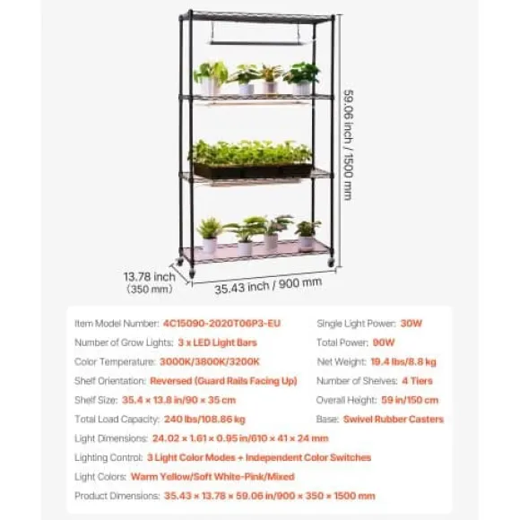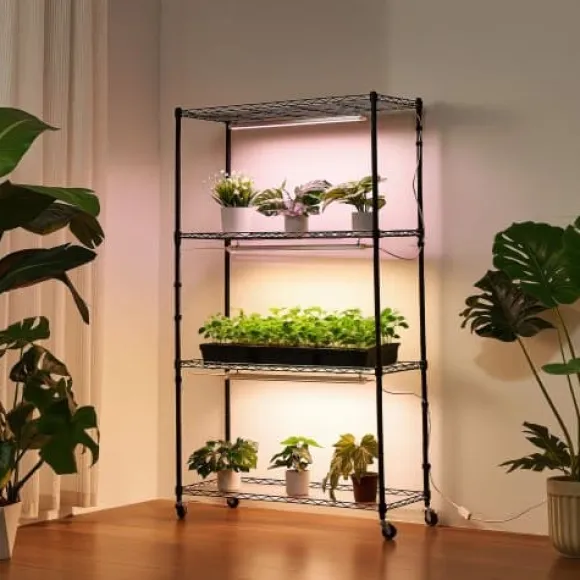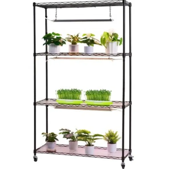 Detta 4-vånings växtställ för inomhusbruk med integrerade fullspektrum växtlampor är perfekt för att odla en mängd olika växter, från plantor till fullvuxna blommor, året runt. För din bekvämlighet har det justerbara hyllor, individuella ljuskontroller och lättrullande hjul för enkel förflyttning. Den robusta metallkonstruktionen ger pålitligt stöd och långvarig hållbarhet för din inomhusträdgård.