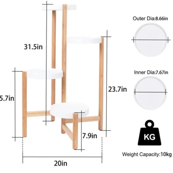 Växtställ i 4 nivåer i bambu med vita brickor – stilrent, stabilt och lättplaceratDetta 4-vånings växtställ kombinerar naturlig bambu med vita plastbrickor för en stabil och dekorativ presentation av flera krukor. Den stegvisa höjden ger bättre ljus åt varje växt – perfekt i vardagsrum, hörn, balkong, uteplats eller kontor.