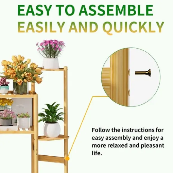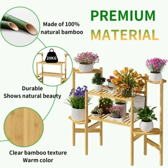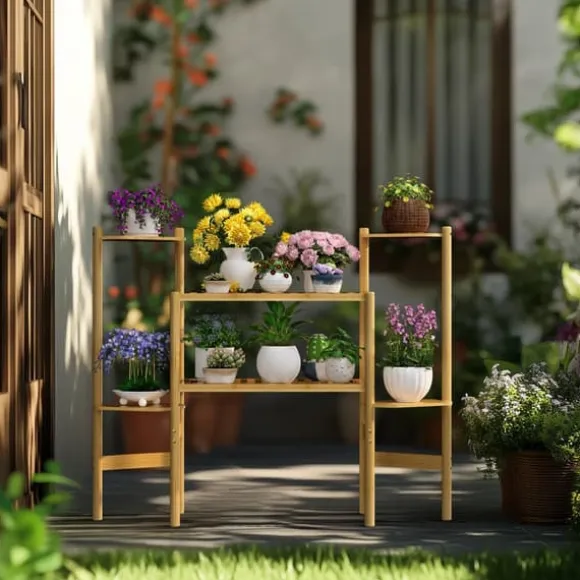 6-nivåers växtställ i bambu – stilrent, stabilt och platsbesparandeDetta minimalistiska växtställ i 100% bambu lyfter fram suckulenter, kaktusar, bonsai och örter på ett elegant sätt i vardagsrum, hörn, balkong eller trädgård. Den naturliga trälooken i gul ton passar de flesta inredningar och ger gott om utrymme på flera nivåer.
