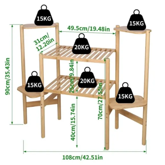 Hög bärförmågaDe mellersta nivåerna klarar upp till 20 kg var, medan sidohyllorna tar upp till 15 kg var – perfekt för tyngre krukor i keramik eller sten.