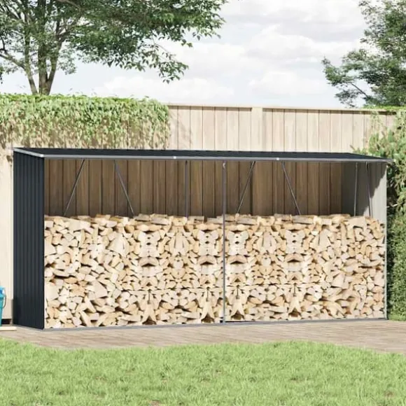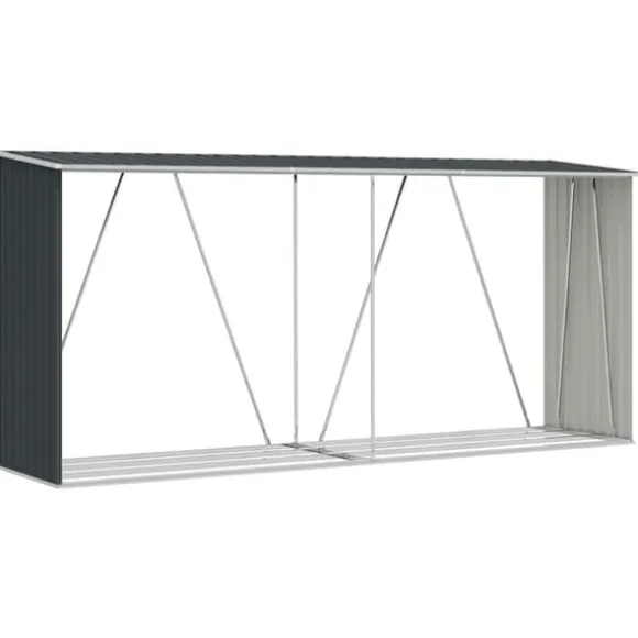 Den har en stabil konstruktion med stödstänger i stål och extra rör på båda sidor. Eftersom det är tillverkat av galvaniserat stål kräver vedskjulet minimalt underhåll och är mycket hållbart. Detta vedskjul inkluderar en golvram i stål för extra stabilitet och upphöjda golvribbor för att hålla veden ventilerade och torra. Regnvatten dräneras automatiskt från taket tack vare dess sluttande design. Vårt vedskjul är enkelt att montera.