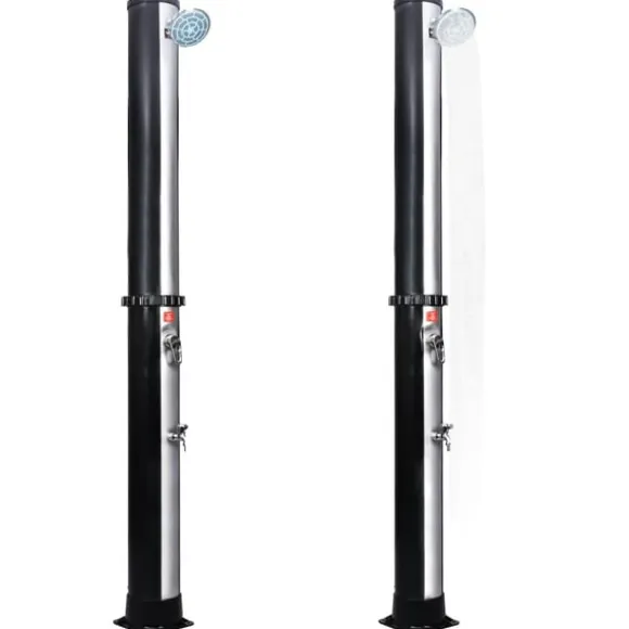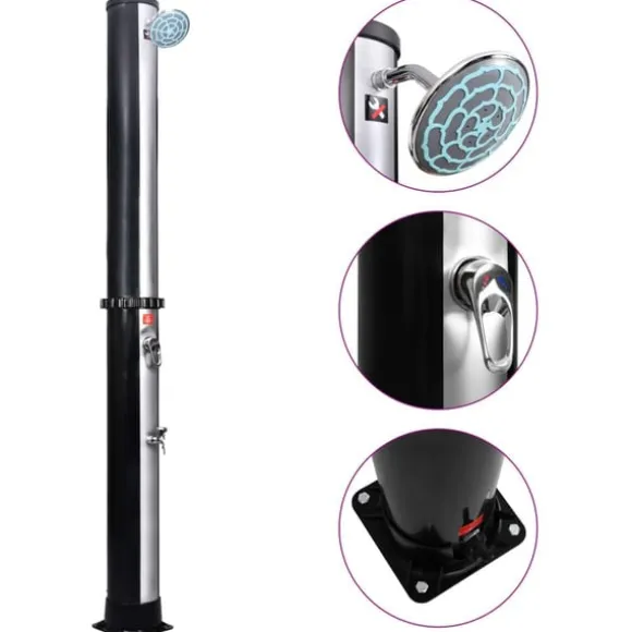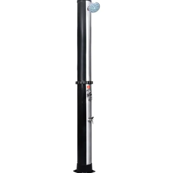Denna soldusch gör så att du kan ta en uppfriskande dusch i din trädgård eller vid din pool före eller efter simningen. Vår dusch kan enkelt kopplas till din trädgårdsslang för tillförsel av kallt vatten. Den absorberade solenergin kan sedan värma vattnet inuti tanken och erbjuda dig en perfekt dusch! Vattentemperaturen kan värmas upp till 60 °C. Den är utrustad med en 40 L tank.