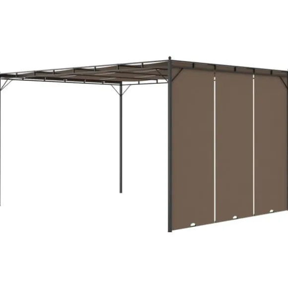 Den har en konstruktion i pulverlackerat stål, som gör ramen hållbar och robust. Soltaket i tyg och sidogardinen skyddar dig mot solen, så att du kan njuta av bättre komfort under dina tillställningar. Du kan justera höjden på draperiet. Dessutom är trädgårdspaviljongen väldigt enkel att montera.
